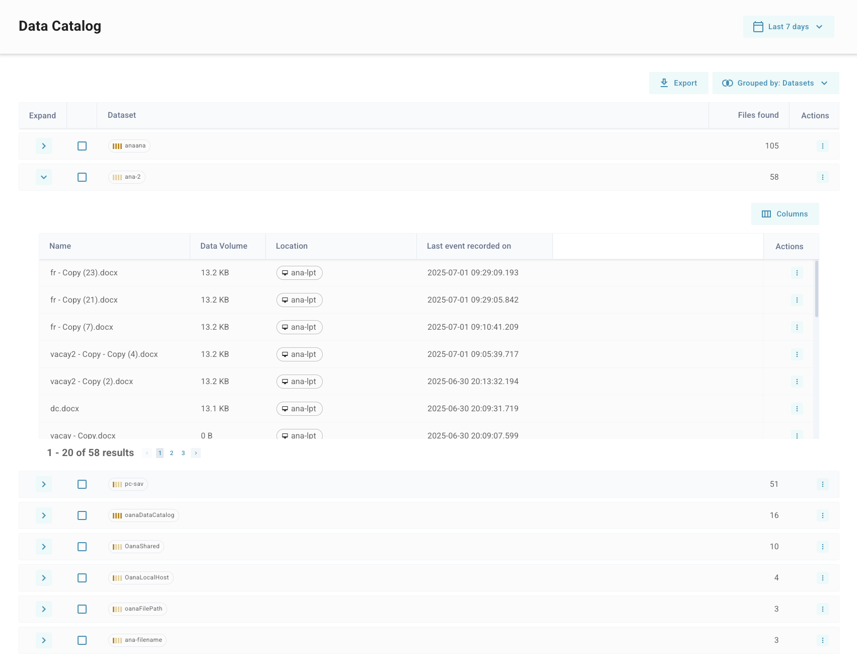 The Data Catalog allows for grouping the reported objects by relevant characteristics as a default to provide an easier path to common workflows. Each group aggregates the view by those characteristics to reduce the total number of elements in the table and give a useful starting point to further investigation.