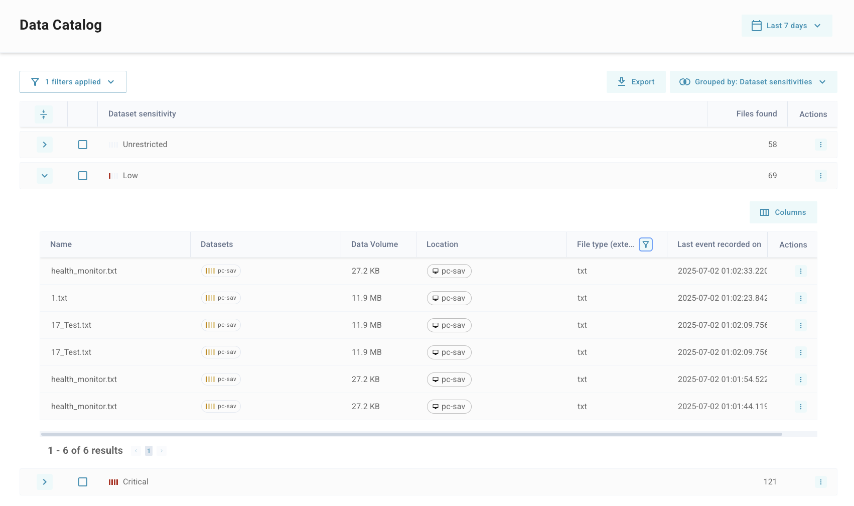 The image abbove shows the data catalog with a grouping applied for dataset sensitivity while also having a filter applied on file type which produces a much reduced list of objects which can be used to pinpoint relevant objects of interest for an investigation.