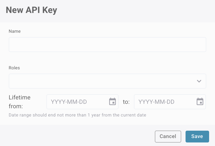 To create a new API key navigate to Settings -> API Keys and select the option to create a new key. The new key dialogue requires the following settings to complete.