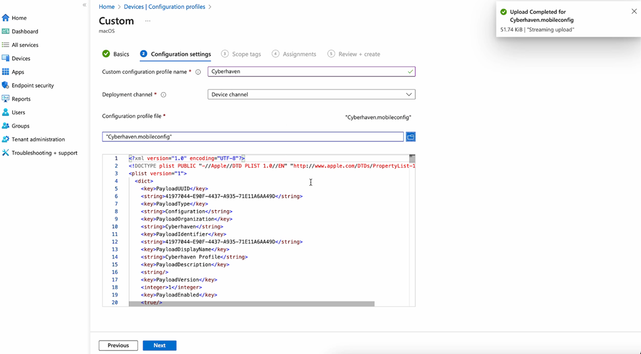 Cyberhaven.mobileconfigfile you downloaded from the Cyberhaven Console. Click Next.4.5. Scope tags are not required. Click Next.