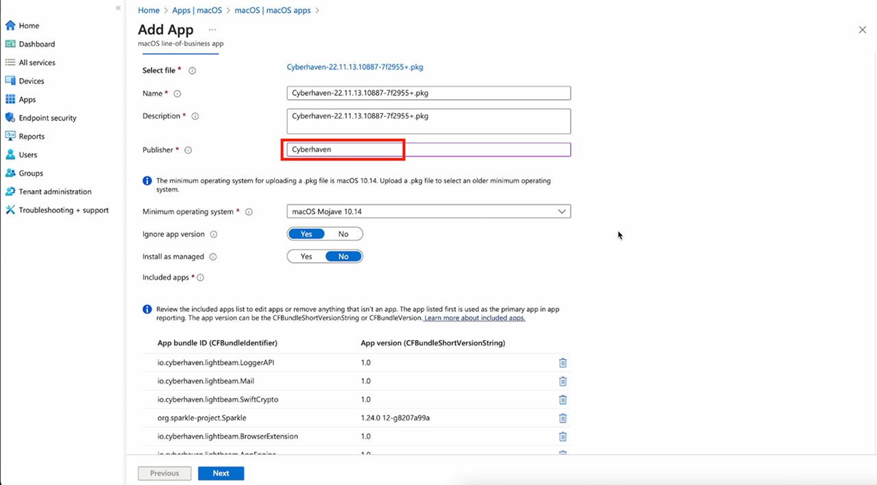Enter the published name as Cyberhaven. Click Next.