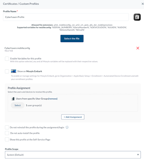 Cyberhaven.mobileconfigfile downloaded from the Console. - Clear the Enable Variables for this Profile checkbox.