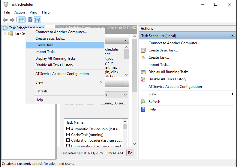 3. In the left nav bar, right-click on Task Scheduler and select Create Task.