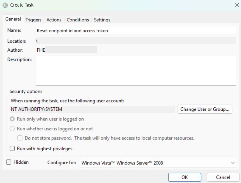 2. Under Security options, set the user account to NT AUTHORITY\SYSTEM to run the task.