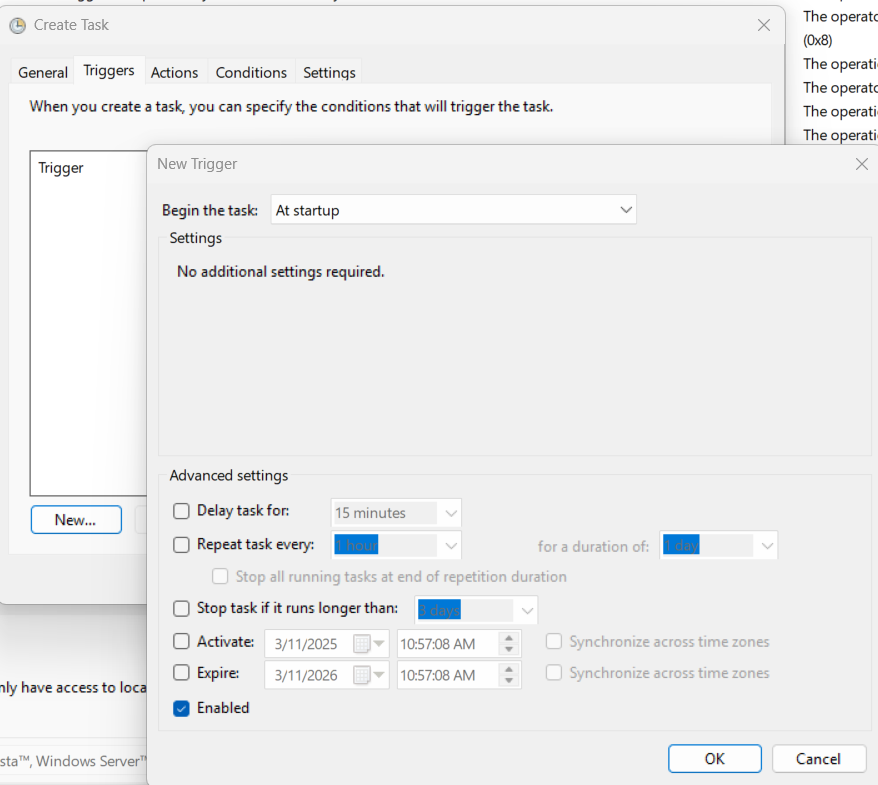 6. In the New Trigger window, select At startup from Begin the task drop down menu. Verify that the trigger is enabled and click OK.
