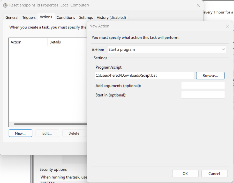 8. In the New Action window, verify that Start a program is selected from the Action drop-down menu. Then, click the Browse button to select the batch file and click OK.