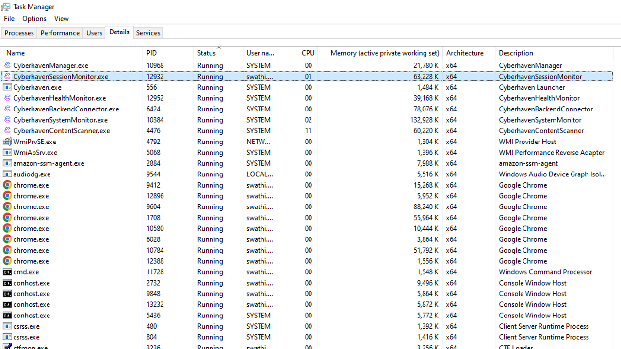 When the installation is complete, the tab will display the Cyberhaven processes.