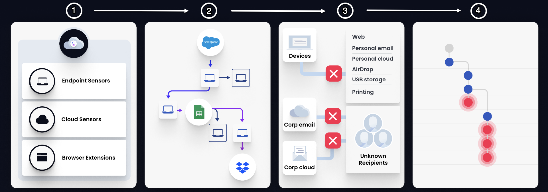 Endpoint Sensors and browser extensions capture data‑in‑use and data‑in‑motion activity on monitored machines and browsers for precise lineage and enforcement.