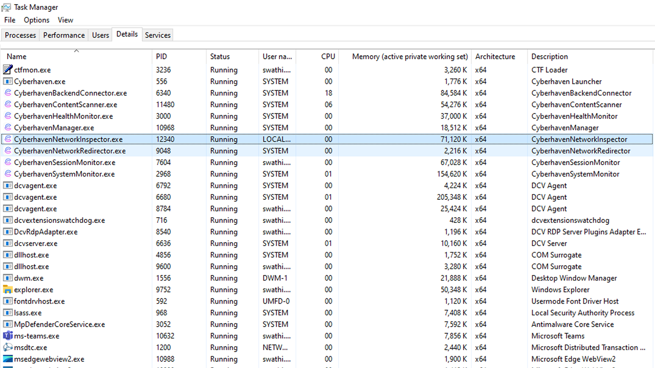 When enabled, the following two Cyberhaven processes are displayed in the Task Manager.