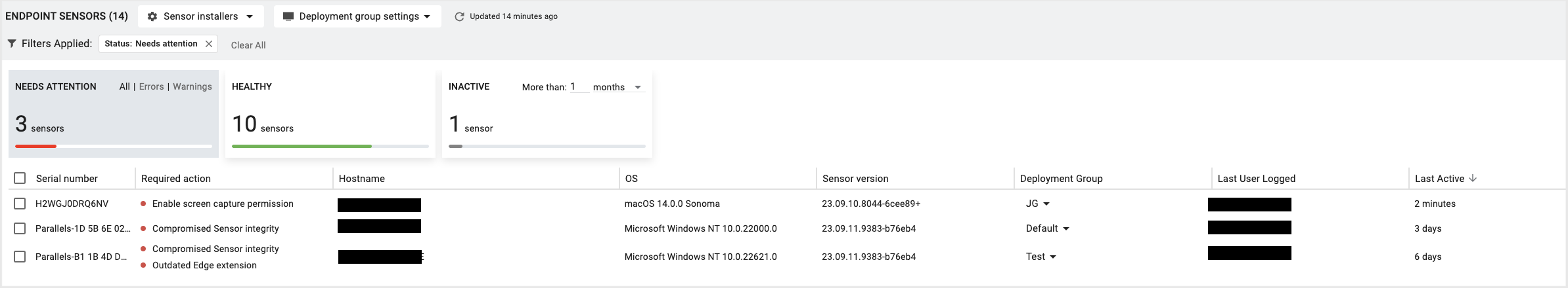 If a deployed Sensor has a health issue, it will be displayed in the Required Actions column. You can view all devices that may have health issues by clicking the Needs Attention filter at the top of the page.