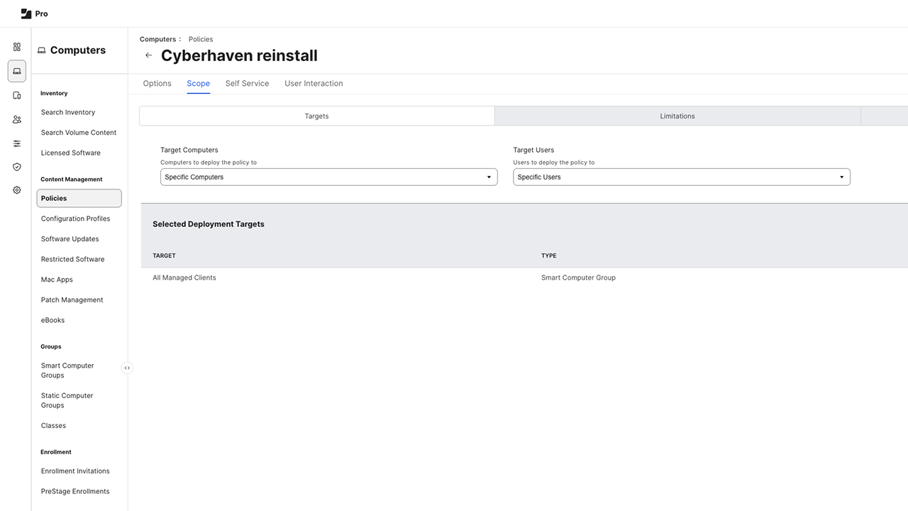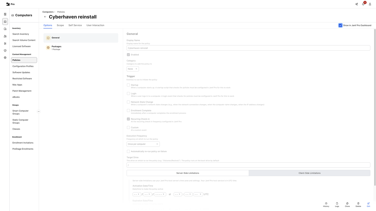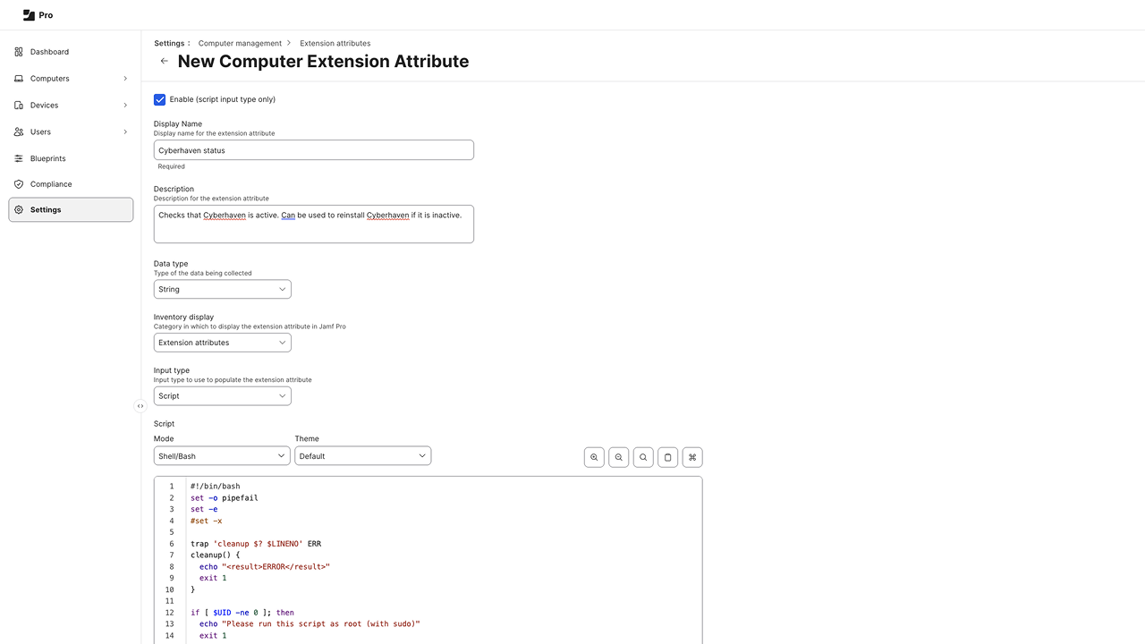 The steps described in this article are optional and only required when you want to provide additional protection and automated remediation actions when the Cyberhaven macOS Sensor was tampered with. While this article is for Jamf, you could adapt it to other MDMs that provide the ability to run scripts.