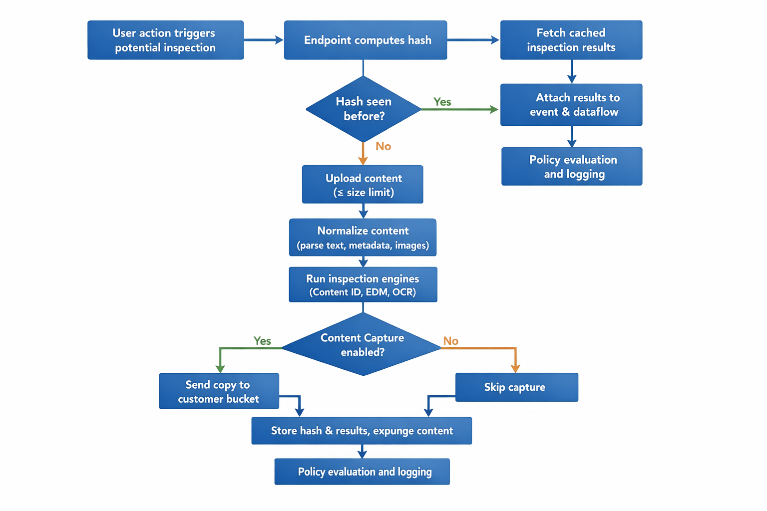 - The backend stores only hashes and inspection results needed for policy decisions and investigations, then expunges the uploaded content. :::