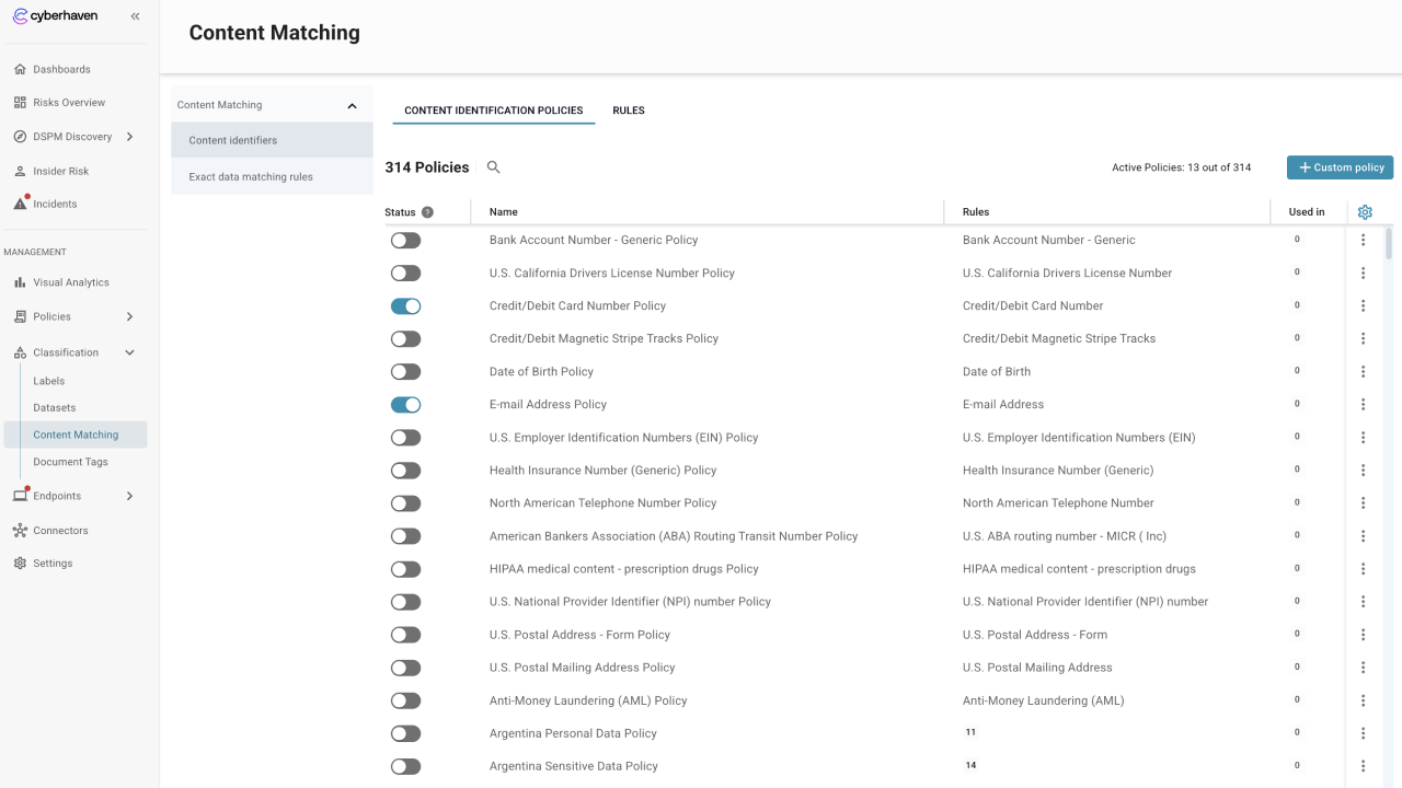 - Content ID policies: Rules that detect patterns in text, such as PII, payment data, or custom regular expressions.