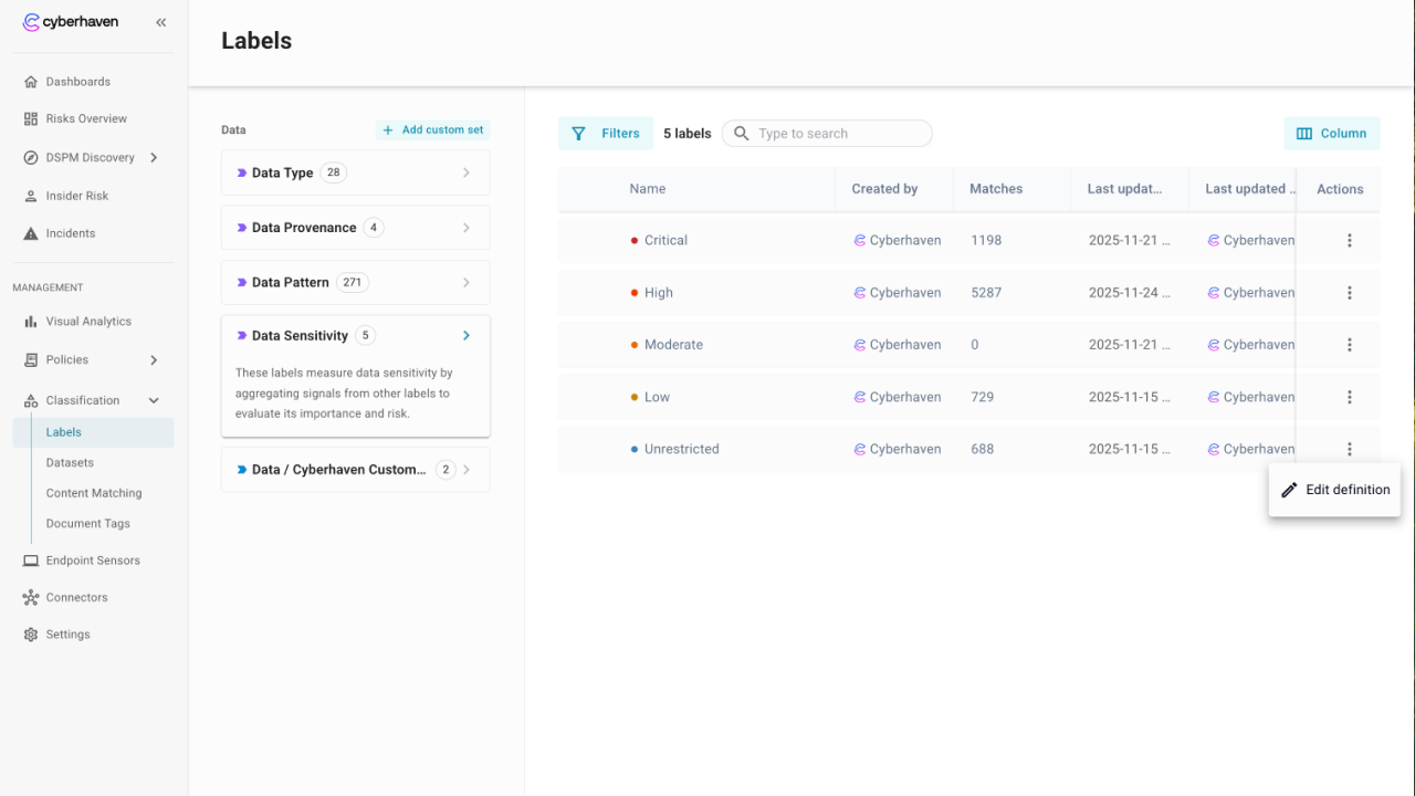 Data Sensitivity labels roll up other labels into an ordered scale of critical, high, moderate, low, or unrestricted. This helps analysts and policies focus on the most important data first. In DSPM EA you can use any existing labels (Data Type, Data Provenance, Data Pattern, or custom label sets) to define how sensitivity should be assigned.