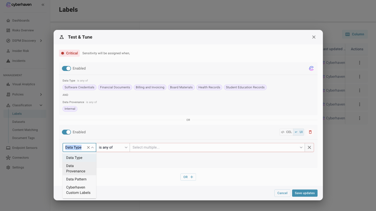 - Use AND when all listed conditions must be true. Example: Data Type is any of Financial Documents and Data Provenance is Internal.