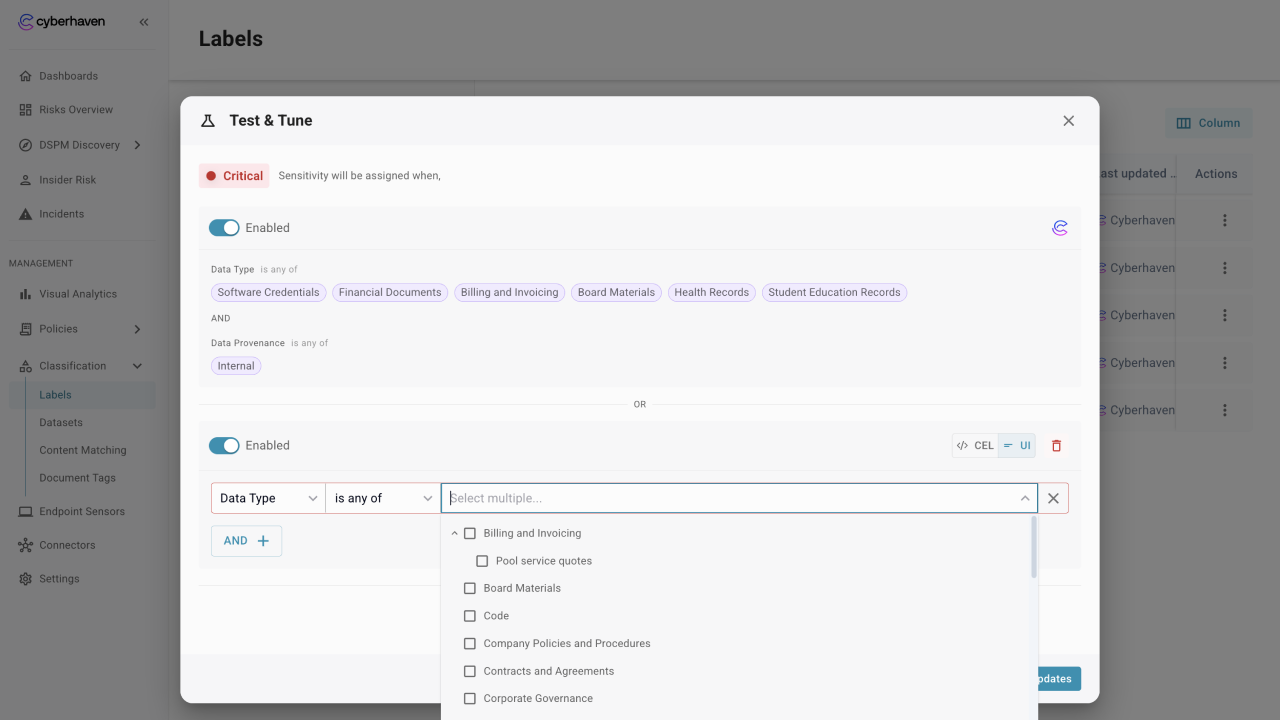 - Start from Cyberhaven defaults for each sensitivity level, then adjust them to fit your environment.