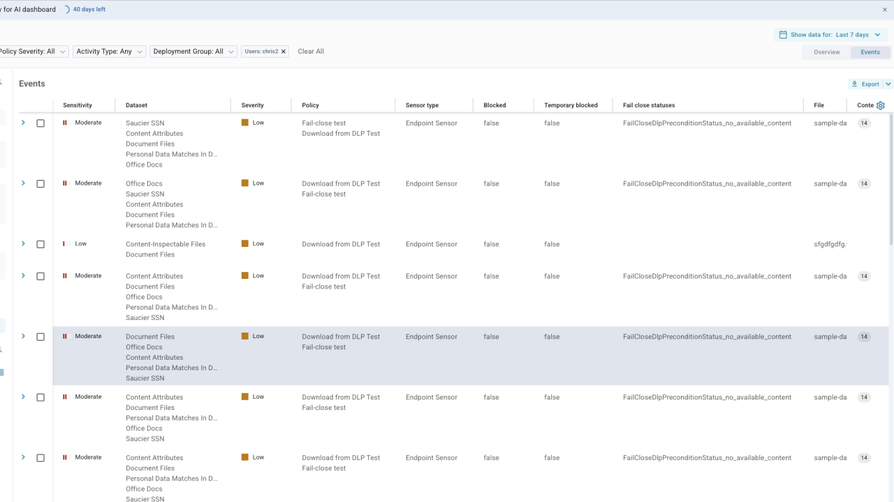 FailCloseActionStatus_blocked- Action was blocked by the fail close mechanism.FailCloseActionStatus_overridden- Block was overridden by user or policy.FailCloseActionStatus_timeout- Action timed out during processing.FailCloseActionStatus_safeguard- Safeguard mechanism triggered to prevent system issues.FailCloseActionStatus_extensionnotloadederror- Browser extension required but not loaded (for browser-based blocking).FailCloseActionStatus_deletion_failed_error- Failed to delete file after download (for download blocking).FailCloseActionStatus_driver_error- Driver-level error during fail close processing.FailCloseActionStatus_event_pattern_error- Event pattern matching error during fail close evaluation.